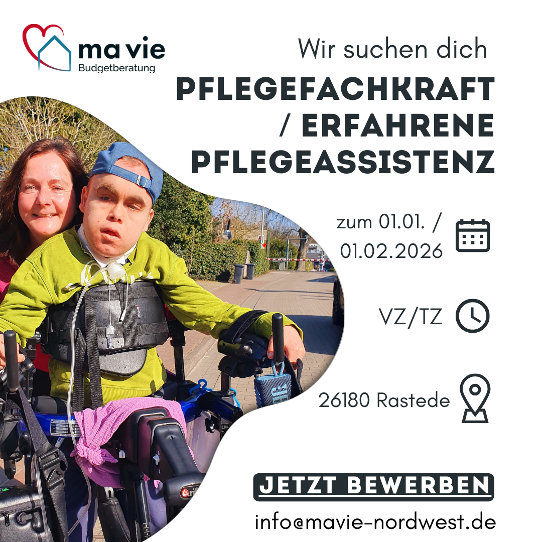 Zur Erweiterung seines häuslichen Pflegeteams sucht unser 20-jähriger Kunde in Rastede zum 01.01.2026 bzw. zum 01.02.2026 zwei weitere Mitarbeiter in Vollzeit oder Teilzeit: 1. für die Tagdienste (idealerweise mit der Bereitschaft, bei Bedarf auch einzelne Nachtdienste zu übernehmen) 2. für die Donnerstag- und Samstagnächte (idealerweise mit der Bereitschaft, bei Bedarf auch an anderen Nächten einzuspringen) Aufgrund eines angeborenen Gendefekts ist der junge Mann wesentlich kleiner als Altersgenossen, kann nicht sprechen und ist rund um die Uhr auf Intensivpflege bzw. Krankenbeobachtung und Betreuung angewiesen. Seine Pflege und Betreuung ist in 2-3 Schichten organisiert. 1. Tagdienste (je 8-10 Std, in Ausnahmen 6 oder 12 Stunden) 2. Nachtdienst (je 10-12 Stunden) Trotz Einschränkungen hat er eine freundliche, positive Ausstrahlung, nimmt sein Umfeld wahr und genießt es, wenn man sich mit ihm beschäftigt, mit ihm spricht, scherzt und Spaziergänge an der frischen Luft macht. Das solltest du mitbringen: • Eine Ausbildung zur Pflegefachkraft ODER Berufserfahrung als Pflegehilfskraft/Pflegeassistenz • Einfühlungsvermögen • Gerne ein wenig Humor und ansteckende Fröhlichkeit Das erwartet dich: • Ein fairer Stundenlohn (Pflegefachkräfte 25,00€/Std.; Pflegeassistenz 22,00€/Std.) • Mitsprache bei der Dienstplangestaltung • Gut erreichbarer Arbeitsplatz: Bahnhof fußläufig + Autobahnanbindung • Direkte Anstellung im Privathaushalt über das Persönliche Budget • steuerfreie Zuschläge für Nachtarbeit, Sonn- und Feiertage • Kein Abzug für Pausen: Kommen bis Gehen = bezahlte Arbeitszeit • Urlaubs- und Weihnachtsgeld • Monatlich 50€ steuerfreier Gutschein Schreib uns gern! Wir freuen uns darauf, dich kennenzulernen!