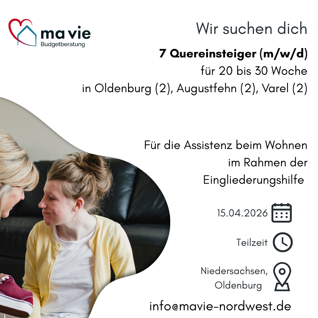Stadtgebiet Oldenburg (2), Augustfehn (3), Varel (2) Arbeitszeiten Teilzeit; die Bereitschaft an Nachmittagen und am Wochenende zu Arbeiten wird vorausgesetzt. Aufgaben Bereich: Assistenz beim Wohnen • Umsetzung der mit dem Kostenträger vereinbarten, individuellen Ziele unserer Kunden • Ermöglichung des Wohnen in der eigenen Häuslichkeit • Ermöglichung der Freizeitgestaltung • Stärkung der Eigenständigkeit, sozialer Teilhabe und Unabhängigkeit von fremder Hilfe • Unterstützung bei der Grundpflege Qualifikation • Eine Qualifikation ist nicht erforderlich. Bewerbungen von Quereinsteigern sind willkommen. • Du verfügst über Verantwortungsbereitschaft, Einfühlungsvermögen, Grundlagenwissen im Sozialrecht, Kreativität und pädagogisches Geschick • Führerschein Klasse B • Ein eigenes Fahrzeug • erweitertes polizeiliches Führungszeugnis Benefits • ein unbefristetes Arbeitsverhältnis • Vergütung nach TVöD-SuE (4) oder TvöD-P 6 • 30 Tage Urlaub • Jahressonderzahlung • Betriebliche Altersversorgung • Teamsitzung und Supervision • regelmäßige Fort- und Weiterbildungen • ein angenehmes Arbeitsklima und ein motiviertes Team