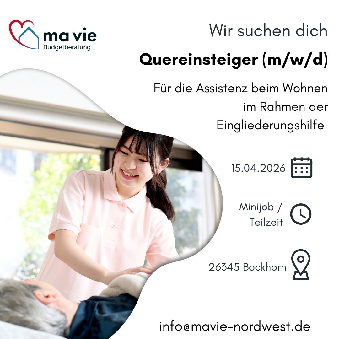 Zur Erweiterung unseres Teams bei ma vie suchen wir eine Assistenzkraft in Bockhorn für eine schwerkranke, vollpflegebedürftige MS-Patientin, die folgendes benötigt: - Hauswirtschaftliche Dienstleistung - Betreuung und Begleitung im Alltag (Spaziergänge, einfach da sein...) - Unterstützung bei der Körperpflege Wann: Wochenende und nachmittags Sie bringen mit: - gerne Erfahrungen in der Pflege - Freude am Umgang mit Menschen - Keine Berührungsängste - Eigenverantwortliches und selbstständiges Arbeiten - Flexibilität - Führerschein Klasse B - eigener PKW Benefits • ein unbefristetes Arbeitsverhältnis • Vergütung nach TVöD • 30 Tage Urlaub • Jahressonderzahlung • Betriebliche Altersvorsorge • Teamsitzung und Supervision • regelmäßige Fort- und Weiterbildungen • ein angenehmes Arbeitsklima und ein motiviertes Team